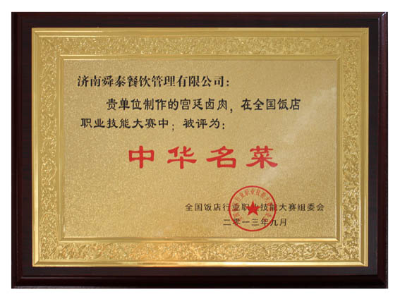 我公司的宮廷鹵肉被評為“中華名菜”